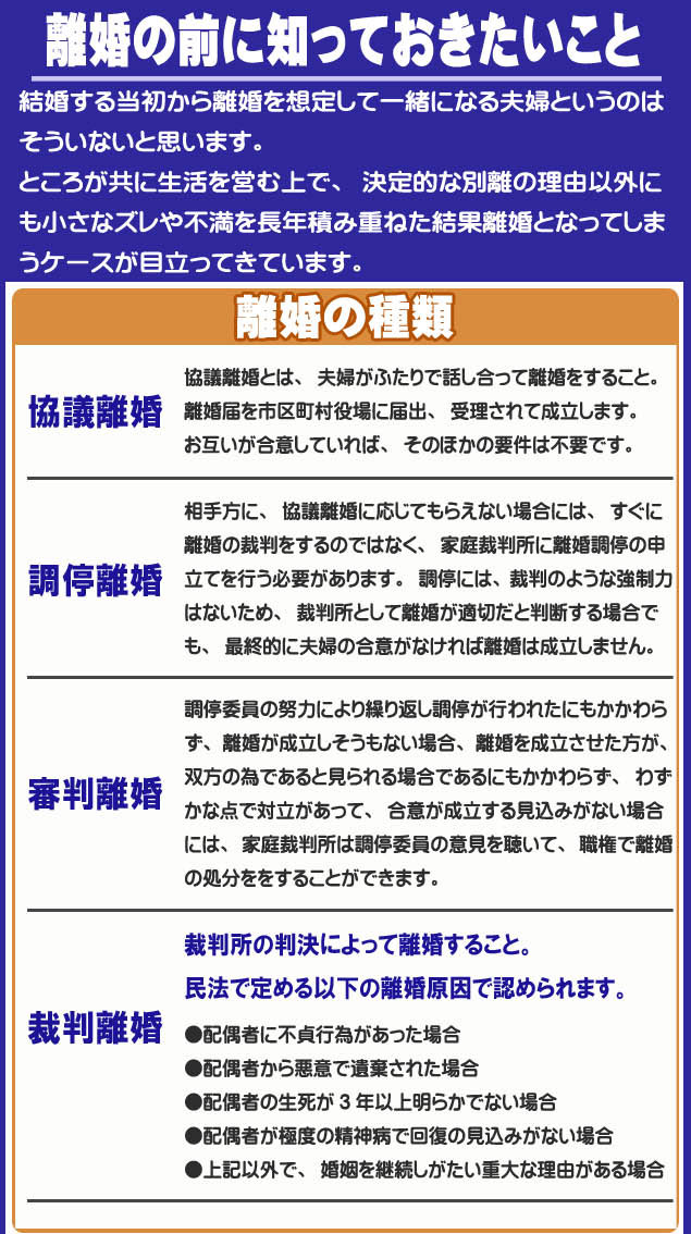 離婚する方法としては、まず夫婦間の話し合いによる協議離婚があります。 話し合いがうまくいかない場合、すぐに離婚を求める訴訟を起こす事は出来ず、 まず調停を申し立てないといけません(調停前置主義)。